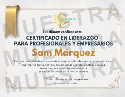 Únete a nuestro programa en línea de certificación en liderazgo para profesionales y empresarios, impartido desde California, Estados Unidos. El programa está diseñado para fortalecer tus habilidades de liderazgo, comunicación y toma de decisiones. Bajo la guía de Marcia Barahona, reconocida coach ejecutiva y fundadora de ExecBloom, explorarás los fundamentos del liderazgo y desarrollarás herramientas prácticas para transformar tu entorno de trabajo o empresa y potenciar a tu equipo.